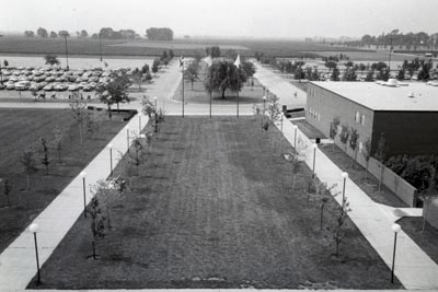 In the grass area south of the college’s main entrance, Horton prescribed specific varieties and placement of trees. He also recommended establishing tree groves in several locations, some with trees planted in honor of former trustees, retiring employees, and graduating student leaders. The groves would reduce the acreage of grass that required frequent mowing, thus cutting maintenance costs. Locating large groves west of the permanent buildings was selected to moderate the effects of prevailing westerly winds.